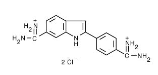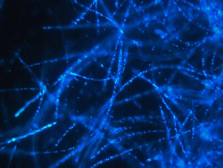 DAPI (4',6-diamidino-2-phenylindole, dihydrochloride) is a dye which binds to DNA and shows an increased blue fluorescence when bound to DNA. The blue fluorescent spots in the picture show the nuclei in the mycel.